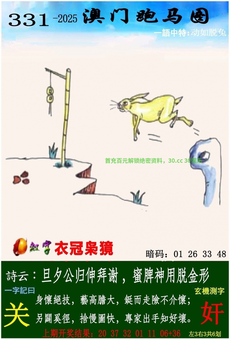 334期解析六肖: 一字記曰:【悠】消遥自在,悠然自得,云头红上三竿日。自成一角,懒理得失,戴胜谷谷催春耕。《祥》 解析:云头红上三竿日:三竿日解日肖兔龙蛇马羊猴。 解特:兔龙蛇马羊猴 |